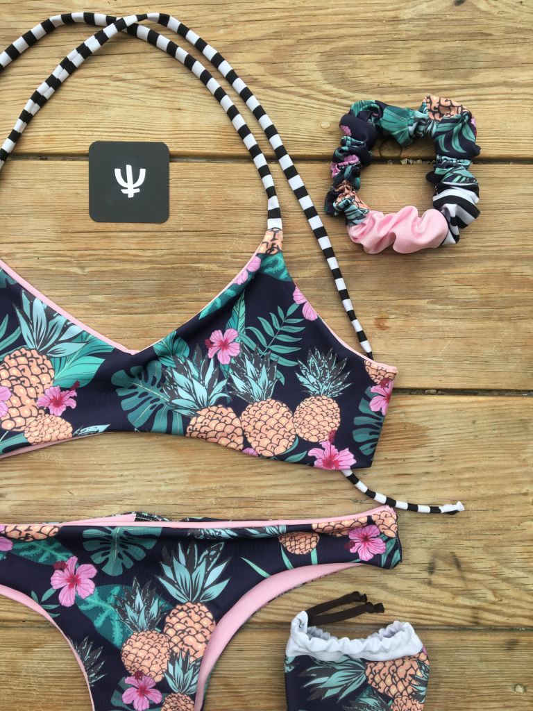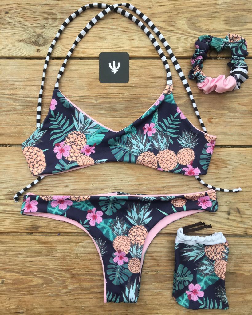 Exotic Pineapple Pattern Design printed on lycra matt, elastic & wet bag matching with this bikini set.